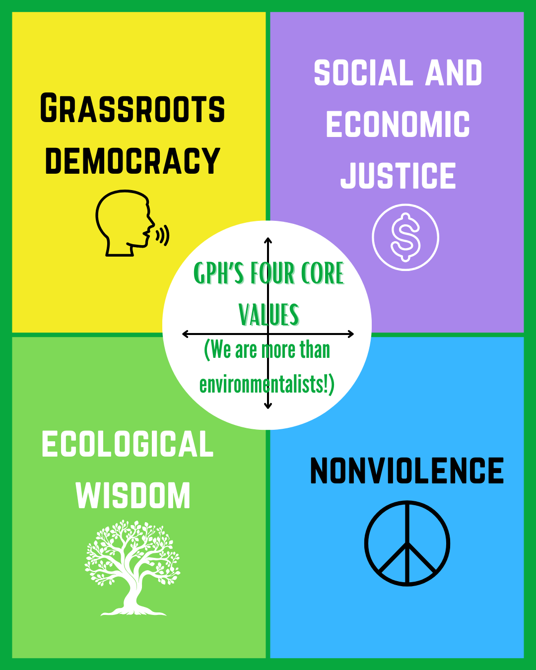 Many people think the Green Party is solely concerned with environmental issues, but in fact it is based on four core values: